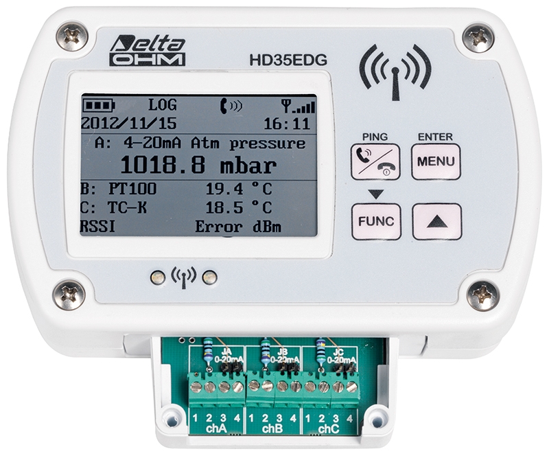 Drahtloser Temperatur-Datenlogger mit drei Eingängen an der Anschlussleiste für den Anschluss von Gebern mit 4 mA bis 20 mA, 0 V bis 1 V oder 0 mV bis 50 mV Ausgang, Pt100 / Pt1000 Sensoren, K-, J-, T-, N-, E-Thermoelementen, Sensoren mit spannungsfreiem Kontaktausgang (max. ein Sensor) und potentiometrische Sensoren. Das Gerät speichert die Messwerte in seinem internen Speicher (36.000 bis 68.000 Messwerte, je nach Anzahl und Typ der angeschlossenen Sensoren) und überträgt die erfassten Daten in regelmäßigen Abständen automatisch oder auf Anforderung an die Basiseinheit. Akustischer Alarm mit integriertem Summer. Konfiguration über HD35-AP-S-Software. Stromversorgung durch interne Batterie. Montage mit fester oder abnehmbarer Wandhalterung (mitgelieferte Halterung oder optionale Befestigungsflansche).
