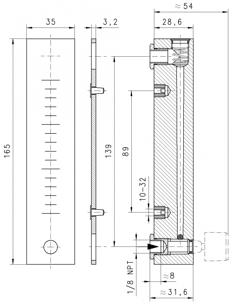 Gesamtanzeigebereich: | 0,6 l/h bis 220 l/h H2O 0,1 NI/min bis 100 NI/min Luft |