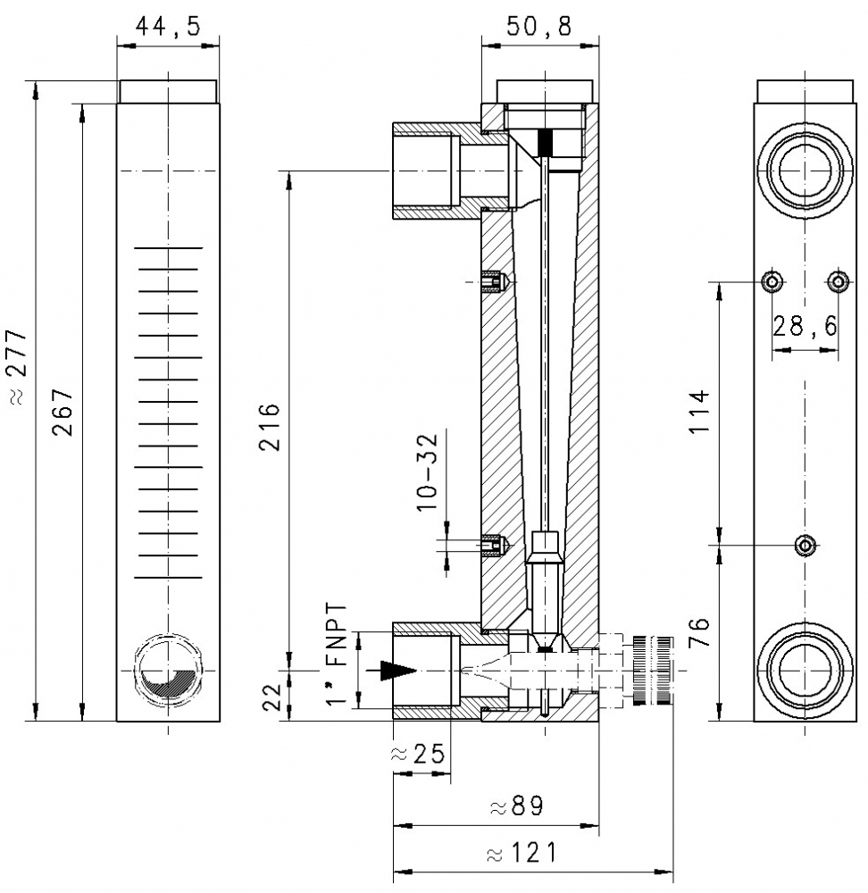 Gesamtanzeigebereich: | 2 l/min bis 75 l/min H2O 100 Nl/min bis 3.000 Nl/min Luft |