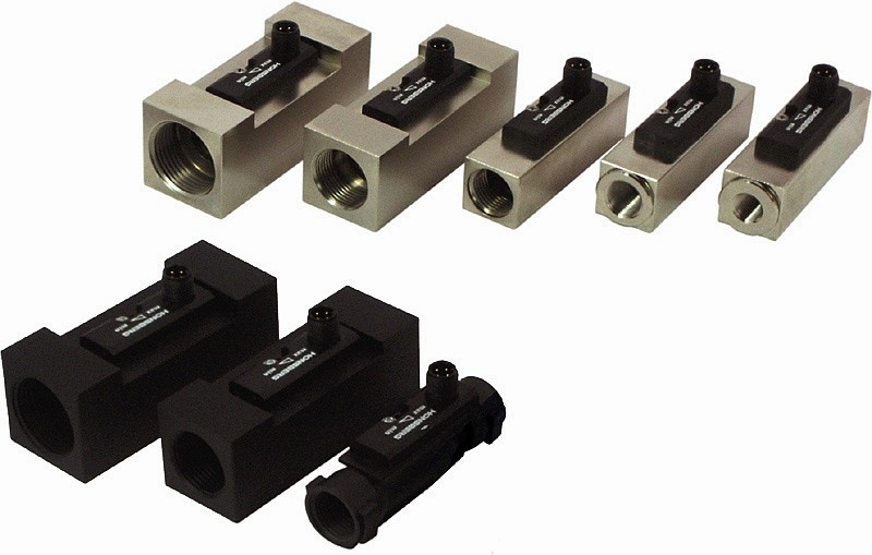 Mechanischer Durchflusswächter für flüssige Medien, mit federgestütztem Kolben und magnetischer Ansteuerung eines Reedschalters. Robuste Konstruktion im Werkstoff POM (FW1-...GP) bzw. in den Werkstoffen Messing und POM (FW1-...GM).