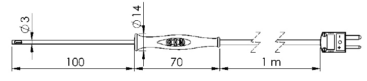 Luftfühler für saubere Medien (bei verschmutzten Medien GF 1TK-T3 verwenden), gelochtes V4A-Rohr Ø 3 mm, Messelement frei angeordnet, schwarzer Silikongriff -50°C bis +250°C, 1 m |