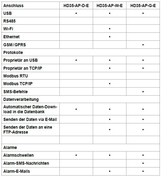 Stromversorgung durch externe 6 V DC Stromversorgung. Interne Backup-Batterie. Wenn der PC nicht angeschlossen ist, erfolgt die Speicherung der Messdaten im internen Speicher (der Speicher wird im Ringspeicher-Modus verwaltet: Wenn der Speicher voll ist, werden die ältesten Daten mit den neuen Daten überschrieben). Akustischer Alarm mit integriertem Summer. Konfiguration über HD35-AP-S-Software. Montage mit fester oder abnehmbarer Wandhalterung (mitgelieferte Halterung oder optionale Befestigungsflansche).