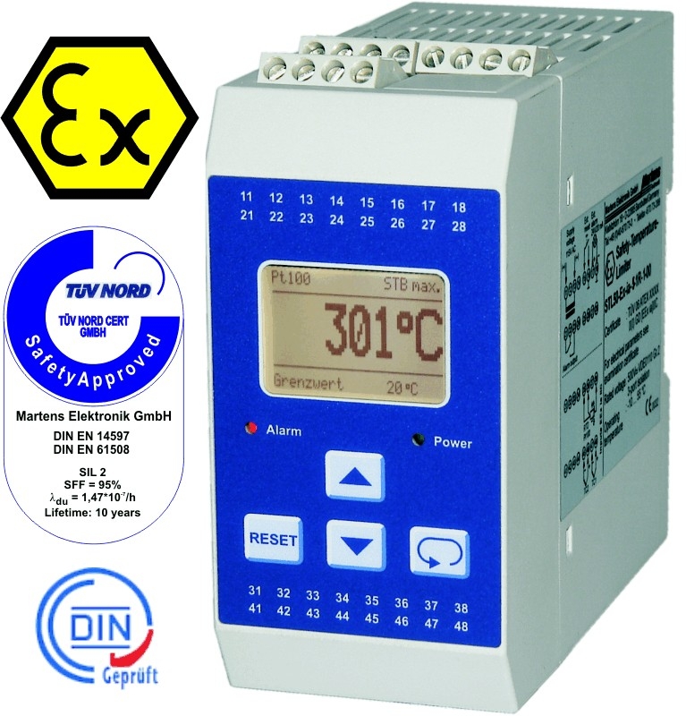Der Sicherheits-Temperaturbegrenzer STL50Ex wird überall dort eingesetzt, wo thermische Prozesse überwacht und die Anlage im Störungsfall in einen sicheren Betriebszustand überführt werden muss. Wird der zulässige Temperaturgrenzwert erreicht oder tritt innerhalb des zulässigen Temperaturbereiches ein Fehler an der Überwachungsvorrichtung auf (Fühlerbruch, Fühlerkurzschluss, Ausfall eines Bauteiles im Gerät, Fehler in der Software, Ausfall oder unzulässiger Wert der Hilfsspannung usw.) schaltet der STL50Ex ohne Verzögerung ab. Der Alarmkontakt wird betätigt, die frontseitige LED ALARM und die Hintergrundbeleuchtung des Displays leuchten, auf dem Display wird die Fehlerursache als Klartext angezeigt. Zusätzlich steht an den Klemmen 16-17 ein 24 V DC-Signal für eine externe Alarmmeldung an. Das Gerät kann alternativ über einen externen Kontakt zurückgesetzt werden. Zudem verfügt der STL50Ex optional über einen programmierbaren Analogausgang mit up- oder downscaling-Funktion, sowie einen Vorkontakt.