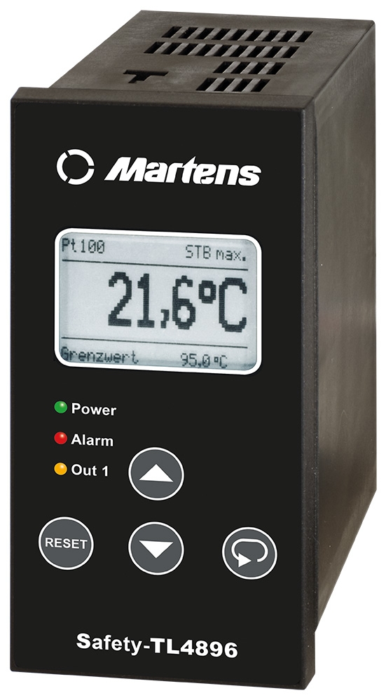 Der Sicherheits-Temperaturbegrenzer STL4896 wird überall dort eingesetzt, wo thermische Prozesse überwacht und die Anlage im Störungsfall in einen sicheren Betriebszustand überführt werden muss. Wird der zulässige Temperaturgrenzwert erreicht oder tritt innerhalb des zulässigen Temperaturbereiches ein Fehler an der Überwachungsvorrichtung auf (Fühlerbruch, Fühlerkurzschluss, Ausfall eines Bauteiles im Gerät, Fehler in der Software, Ausfall oder unzulässiger Wert der Hilfsspannung usw.) schaltet der STL4896 ohne Verzögerung ab. Der Alarmkontakt wird betätigt, die frontseitige LED ALARM und die Hintergrundbeleuchtung des Displays leuchten, auf dem Display wird die Fehlerursache als Klartext angezeigt. Zusätzlich steht an den Klemmen 16-17 ein 24 V DC-Signal für eine externe Alarmmeldung an. Das Gerät kann alternativ über einen externen Kontakt zurückgesetzt werden. Zudem verfügt der STL4896 über einen programmierbaren Analogausgang mit up- oder downscaling Funktion, sowie einen Vorkontakt.