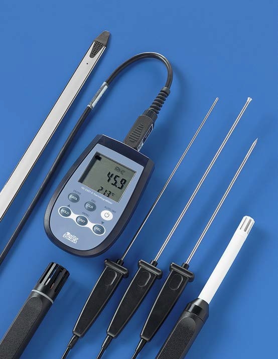 Die Temperatur wird durch Pt100 oder Pt1000 Tauch-, Einstech-, Luft- oder Kon-taktsonden gemessen. Wenn die Kombisonde für Temperatur und Feuchte angeschlossen ist, berechnet und zeigt das Gerät die absolute Feuchte, den Taupunkt und den Partialdampfdruck. Die Sonden sind mit einem automatischen Detektionsmodul, auf dem die Daten der Werkskalibrierung gespeichert sind, ausgestattet.